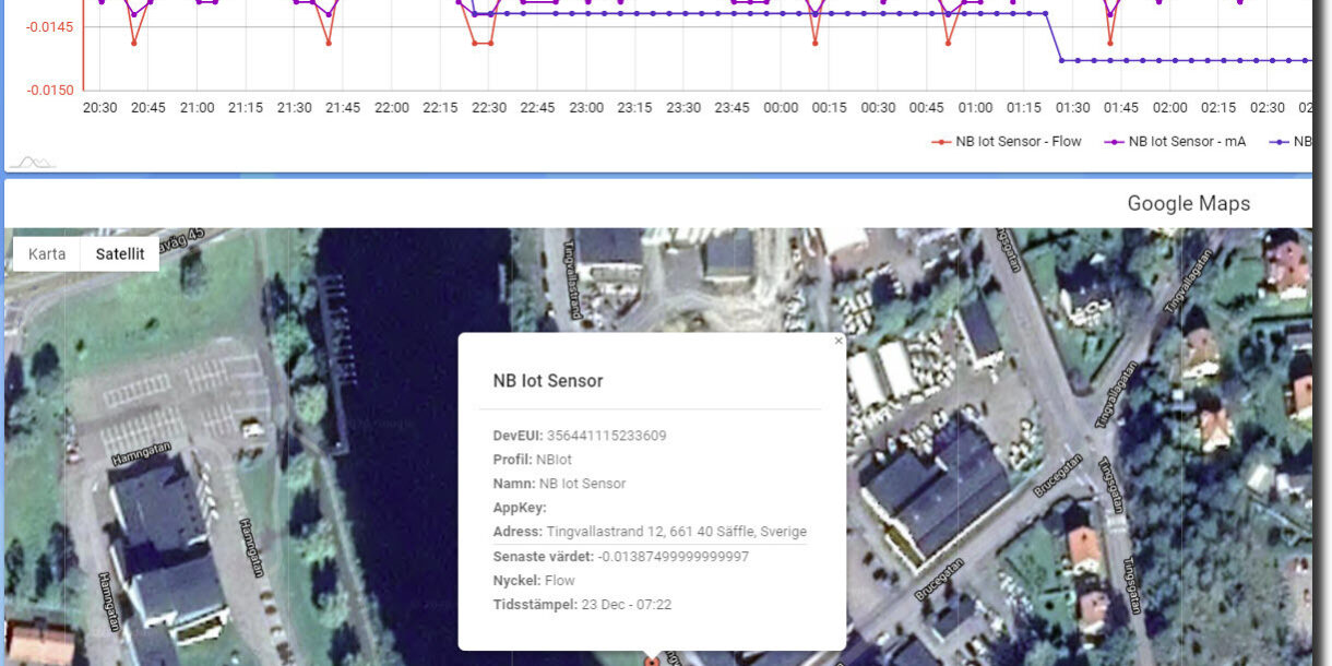 Med många sensorer i sitt system blir det naturligtvis mycket enklare att ha dem utplacerade på en zoombar onlinekartakarta. Markörernas färg speglar sensorn alarmtillstånd, grön ikon=normal, röd ikon=larm.